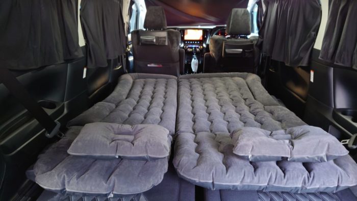 - 車中泊用ベッドを敷くと空気圧で段差が無くなり平らになる。
